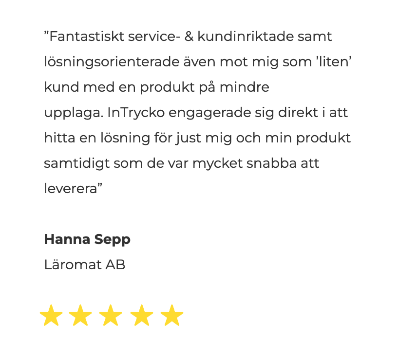 ”Fantastiskt service- & kundinriktade samt lösningsorienterade även mot mig som ’liten’ kund med en produkt på mindre upplaga. InTrycko engagerade sig direkt i att hitta en lösning för just mig och min produkt samtidigt som de var mycket snabba att leverera”