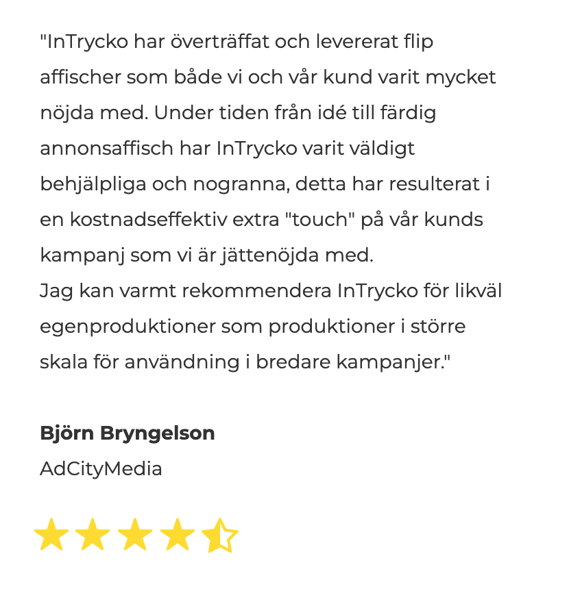 "InTrycko har överträffat och levererat flip affischer som både vi och vår kund varit mycket nöjda med. Under tiden från idé till färdig annonsaffisch har InTrycko varit väldigt behjälpliga och nogranna, detta har resulterat i en kostnadseffektiv extra "touch" på vår kunds kampanj som vi är jättenöjda med.